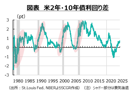2022年ごろに景気後退のシグナルとして注目された米2年・10年債利回りの逆転は、2024年後半に解消された。過去を振り返ると、2年・10年債利回りの逆転後に
