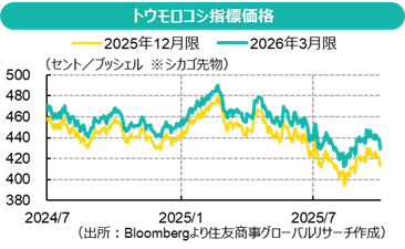 米国農務省の四半期在庫報告では、9月1日時点の在庫(2024/25年度産の期末在庫=2025/26年度産の期初在庫に相当)が市場予想を大きく上回った。2024/25年度の飼料用・エタノール用などの内需が従来想定よりも低かった可能性がある。繰り越し在庫が多く、需要伸び悩みと豊作が重なると、低価格推移が続く公算が高まる。