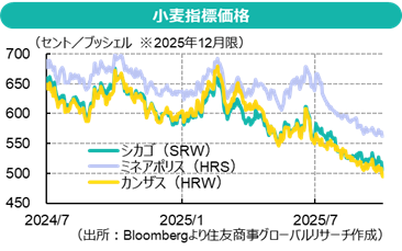 世界の小麦価格は弱い推移が続いている。シカゴ小麦(軟質赤色冬小麦)先物の9月終値は2025年12月限が前月末比▲4.9%安の1ブッシェル5.08ドル。Euronextのパリ製粉小麦も前月末比▲4.0%安の186.25ユーロ/トン。