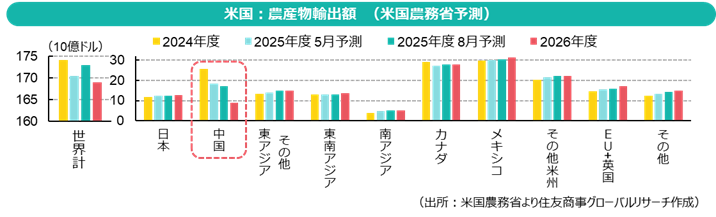 2025/26年度も、豊富な供給を追い風に、輸出を拡大する見通しが示されている。これから生育期を迎える南米では、ブラジルが前年比で小幅減産の見込み。一方、アルゼンチンでは過去最高の収穫高が見込まれている。中国は国内生産を奨励して穀物輸入を制限しており、安価なトウモロコシの飼料配合が増えても輸入量は前年比微増程度の見込み。