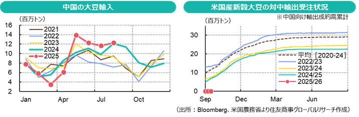 中国の2025年1~8月の大豆輸入量は7,332万トンと、前年同期比+4%増加した。輸入量の72%がブラジル産、23%が米国産となっている。この比率は、中国はトランプ政権1期目の貿易戦争を境にブラジルからの調達比率を大幅に高めたこと、米国と南米は季節が反対であるため米国産大豆の輸入は第4~第1四半期、南米産は第2~3四半期が多くなるのに起因する。しかし、米国産大豆の輸入量も前年同期比で増えており、トランプ第2次政権での貿易戦争を見越し、2024年秋に収穫された米国産大豆の購入を増やして在庫を積んだものと推測される。