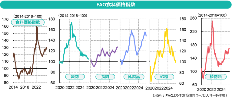 - 食料価格のトレンドは二極化。穀物・砂糖が軟調、食肉・乳製品・植物油は高値推移