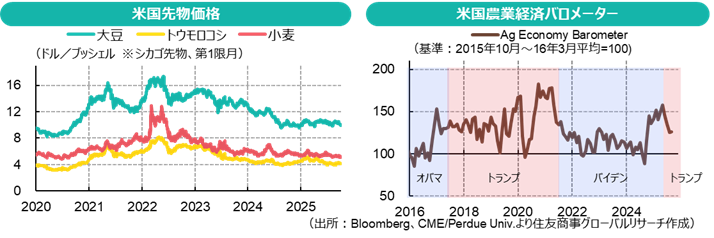 米国は収穫の秋を迎えている。2025年度の冬小麦・トウモロコシ・大豆はいずれも順調に生育し、トウモロコシは過去最高の収穫高となる見通しだ。収穫期の供給圧力で相場が値下がりするのは珍しくないが、第3四半期は農業景況感の指数も急低下している。作物価格は2020~21年以来の安値圏での低迷が続く一方、コストや金利は当時よりはるかに高く、農家の収益は圧迫されている。2025年は貿易戦争の影響で、中国が米国産の新穀大豆のボイコットを続けており、収穫が進むにつれて需要不足と収入に対する作物農家の不安は募る。