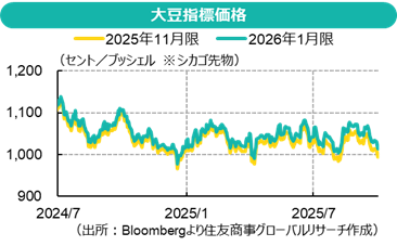 シカゴ大豆先物相場は、2025年に入り、1ブッシェル10ドル台前半を中心とするボックス圏レンジが続いている。米国の2025年度産大豆は前年度比で▲1.5%前後の減産が見込まれるが、収穫高にある程度のめどがつき、既に収穫が開始したことで、2025年9月の相場では需要面に焦点があたった。その結果、上値の重い推移が続いた。