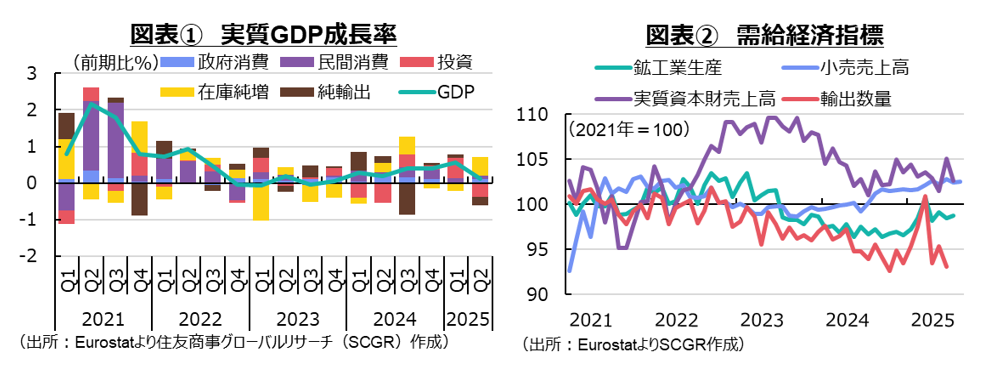 ユーロ圏経済は、緩やかに回復している。2025年第2四半期(Q2)の実質GDP成長率(前期比+0.1%)は、7四半期連続のプラス成長になった。米国向け輸出の反動減によって、成長ペースはQ1(+0.6%)から減速した。国別に見ると、フランス(+0.3%)やスペイン(+0.8%)がプラス成長を保った一方で、ドイツ(▲0.3%)は4四半期ぶりに、イタリア(▲0.1%)は8四半期ぶりにマイナス成長に転じた。こうした中で、物価上昇率は欧州中央銀行(ECB)の中期目標の2%付近にあり、利下げ打ち止めも示唆されている。