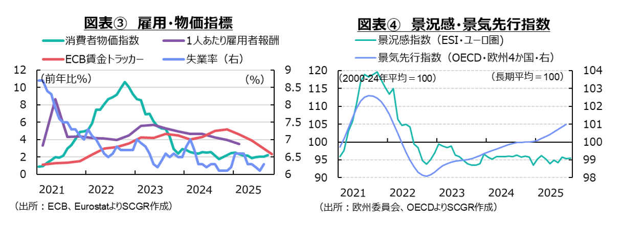 雇用環境は、回復している。6月の失業率(6.3%)は低水準を維持しており、雇用環境は底堅い。2023年に景気が減速した際も、雇用環境は底堅さを維持しており、景気底割れを防いだとも言える。しかし、足元では一部企業の雇用調整などから、25歳未満の若年失業率(15.2%)は上昇していることが懸念される。また、ECB賃金トラッカーによると、賃金上昇率は2025年末にかけて2%を下回ると予想されている。賃金上昇率が物価上昇率を上回るため、実質購買力の回復は続くものの、その回復ペースは減速すると予想される。