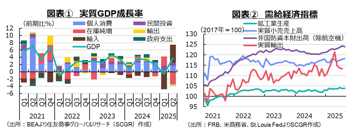 米国経済は、緩やかに成長してきたものの、足元では減速しつつある。2025年第2四半期(Q2)の実質GDP成長率(前期比年率+3.8%)は、12四半期ぶりのマイナスになったQ1からプラスに転じた(図表①)。2025年Q2のGDPは改定されるたびに上方修正されており、景気の底堅さもうかがえた。