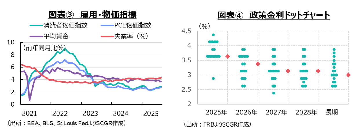 また、米政権の介入が経済に悪影響を及ぼしつつあることも懸念される。例えば、FRBの人事への介入が挙げられる。トランプ大統領はクックFRB理事の解任を発表し、訴訟沙汰になっている。最高裁判所の判断からクック氏は2026年1月の口頭弁論まで理事職を継続することになり、9月のFOMCにも参加した。また、突如辞任したクグラー前理事の後任にミラン大統領経済諮問会議(CEA)委員長を充てた。大幅利下げを主張していたミラン氏は9月のFOMCで0.5%利下げを支持した。トランプ氏は再三にわたり、パウエルFRB議長の解任を口にしてきた中で、外堀を埋めるようにFRBへの介入を強めている。2026年1月末には地区連銀総裁の任期も迫っており、政権がどこまで圧力を強めるのかが懸念される。