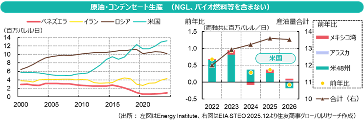 こうした政策介入は、米国の石油産業にとっては必ずしも好ましいものではない。トランプ大統領の思惑通りに原油が1バレル50ドル近くまで下落すれば、米国内のシェール企業の経営は圧迫される。2025年12月時点で、ダラス連邦準備銀行が公表した四半期エネルギー調査では、既に景況指数はマイナス圏にあり、米エネルギー情報局(EIA)は2026年に米国シェール生産が減少に転じる可能性を示唆。米国政府は油価押し下げ、石油業界の保護、さらなる地政学的緊迫化に備えた戦略石油備蓄(SPR)補充など、難しいかじ取りを迫られることになる。
