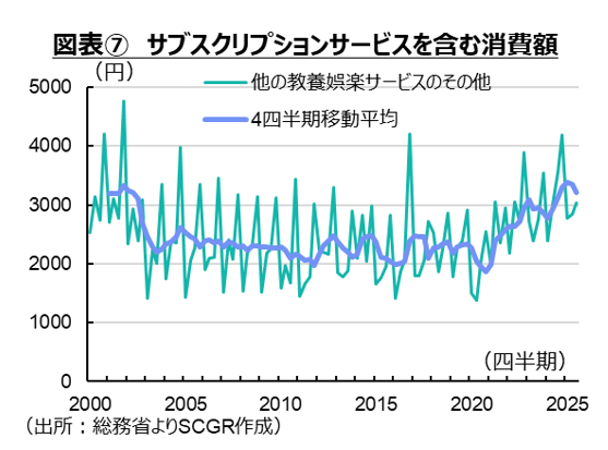 また、個人消費自体の変化も見られる。例えば、「所有」から「使用」へ消費の概念が変化している面も指摘されている。「家計調査」(総務省)の消費支出のうち「他の教養娯楽サービスのその他」には、宝くじ・競輪・競売の券、英語検定受験料・技能テストなどに加えて、ダウンロード代(音楽・映画・動画)、コンテンツ月額利用料(音楽・映画・動画)、電子書籍・電子新聞が含まれている。そのため、この分類にサブスクリプション消費に関連するものが一部含まれている。その動きをみると、2020年頃を境に増加している様子が確認できる(図表⑦)。