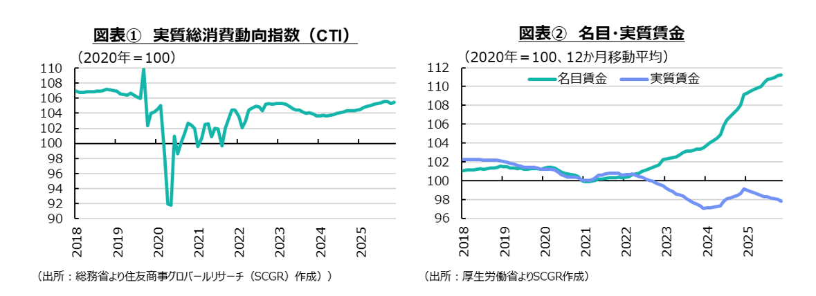 日本の個人消費が、思いのほか底堅く推移している。例えば、GDP統計(内閣府)によると、個人消費(民間最終消費支出)は2024年第2四半期(Q2)以降、途中ゼロ%を挟みながら、前期比マイナスではない状態が続いている。また、実質総消費動向指数(総務省)も2024年4月から2025年9月まで途中ゼロ%を含みつつ、前月比マイナスではない状況が続いた(図表①)。10月(▲0.2%)には、2024年3月以来のマイナスになったものの、11月(+0.1%)には直ぐにプラスに戻った。12月の「月例経済報告」(内閣府)でも、個人消費は「持ち直しの動きがみられている」と評価されている。