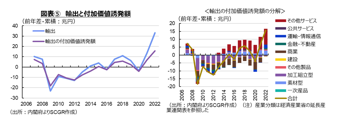同じように輸出について、最終需要の輸出額とそれによって誘発される付加価値額を計算した(図表⑤)。なお、この輸出は財だけではなく、サービスも含まれている点に注意が必要だ。輸出額は2008年の世界金融危機時に大幅に落ち込んだ後、2010年代後半にかけて回復してきた。コロナ禍後の2022年には、貿易統計の輸出額が100兆円に迫ったように、物価上昇や円安効果によって大幅に増加した。