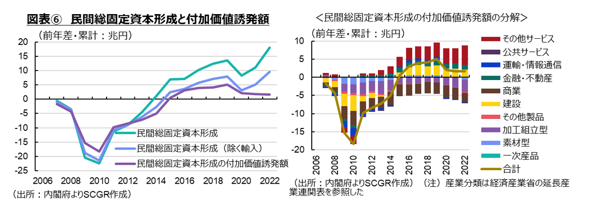 また、図表⑥右のように、付加価値誘発額はおおむね民間総固定資本形成(除く輸入)と同じような動きだったものの、コロナ禍後に乖離(かいり)が生じている。付加価値誘発額を産業別にみると、加工組立型製造業や商業などの減少が目立っている。建設業が2010年代半ばから増加してきた中で、対事業所サービスが含まれるその他サービス業がけん引役だった。そのため、企業の投資と言っても、国内生産によって付加価値が創出されたのは建設や対事業所サービスなどその他サービスだった。