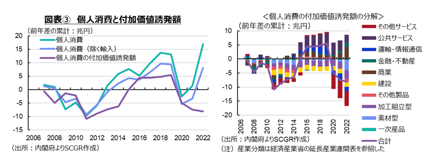 図表③右のように、個人消費の付加価値誘発額を産業別に分解すると、2022年時点で商業や金融・不動産業、公共サービスがプラスである一方で、素材型製造業や加工組立型製造業、その他の製品、建設業、運輸・情報通信、その他のサービスなどがマイナスになっており、相対的に後者の方が大きい。最終需要である個人消費の中身の変化とともに、供給側の生産体制の変化もあり、結果として、これらの産業で生み出される付加価値が2006年よりも減少している。