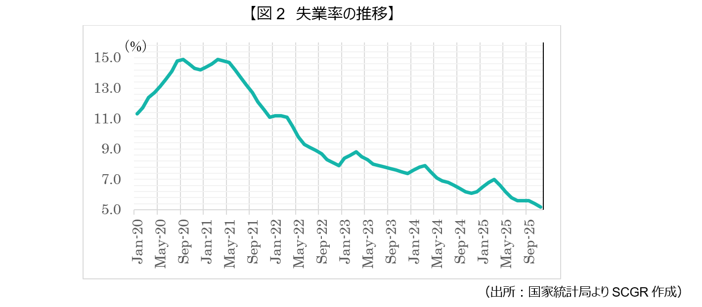 2024年から2025年にかけて、ブラジルの労働市場は極めて強い回復力を見せている。失業率は6%を下回る歴史的な低水準(直近では5.7%前後)で推移している。この雇用を支えているのは、サービス業を中心とした堅調な内需であり、政府による現金給付制度(ボルサ・ファミリアなど)の拡充や最低賃金の大幅な引き上げが、家計の購買力を下支えし、雇用を押し上げている。ただし、労働市場のひっ迫は、中央銀行にとって「インフレの再燃」という深刻なリスクを意味する。人手不足により、企業は労働者を確保するために給与を引き上げる必要に迫られており、企業のコスト増を招き、それが価格転嫁されることでインフレを誘発する。ブラジルでは、サービス業は製造業に比べて労働集約的であるため、賃金上昇が直接価格へ反映されやすい傾向があり、特にサービス価格の下げ渋りが顕著となっている。この強さがインフレ抑制を優先する中央銀行の意向と衝突するというジレンマに陥っている。労働市場のひっ迫が緩和されない限り、物価上昇圧力が消えず、本格的な利下げサイクルへの移行がずれ込んでいる。今後、ブラジル経済がソフトランディングできるかは、生産性の向上によって賃金上昇を吸収できるかにもかかっている。