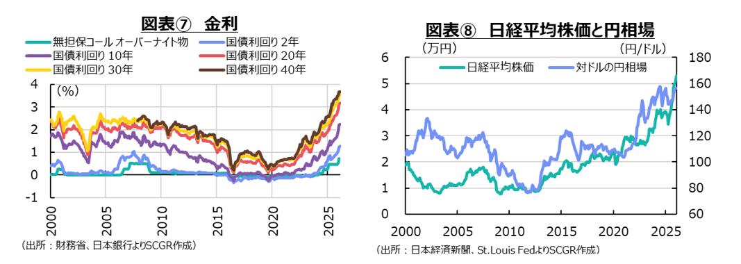 「責任ある積極財政」のうち、どちらかというと「責任」に債券市場が焦点を当てている一方で、「積極財政」を株式市場は重視しているようだ。自民党大勝によって積極財政が推進されるという見方などから、日経平均株価は衆院選後、連日で過去最高を更新した(図表⑧)。その一方で、金利上昇に直面して、高市首相は食品の消費税減税の財源として新規国債の発行を否定するなど、財政規律への配慮を示しており、積極財政一辺倒ではないことを示した点は安心材料の一つになった。見たいものしか見ないのならば、思わぬリスクを見逃しかねない。「責任ある積極財政」の名のとおり、金利のある世界において、衆議院で与党が過半数を握った中で、「責任」と「積極」のバランスがますます重要になっている。