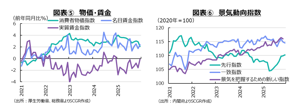 個人消費は、緩やかに持ち直している。12月の実質総消費動向指数(前月比▲0.2%)は2か月ぶりに減少した。2025年Q4は前期比▲0.2%と、2024年Q1以来7四半期ぶりのマイナスになったものの、ならしてみれば2年弱にわたって緩やかな増加基調が継続してきた。これまで賃金上昇率が物価上昇率に追いつかず、物価高が継続したことに加えて、地域によっては熊の出没などから外出が控えられたり、観光客が減少したりするなど、2025年末にかけて個人消費に下押し圧力がかかりやすかった。ただし、賃上げの広がりなどもあって、消費者マインドの緩やかな持ち直しが消費の下支えになっており、個人消費の緩やかな持ち直しという基調はまだ崩れていないだろう。また、12月にはガソリンの旧暫定税率廃止に伴う補助金支給に加えて、2026年からは電気・ガス代補助なども実施されることも、今後の消費の下支え要因になると期待される。