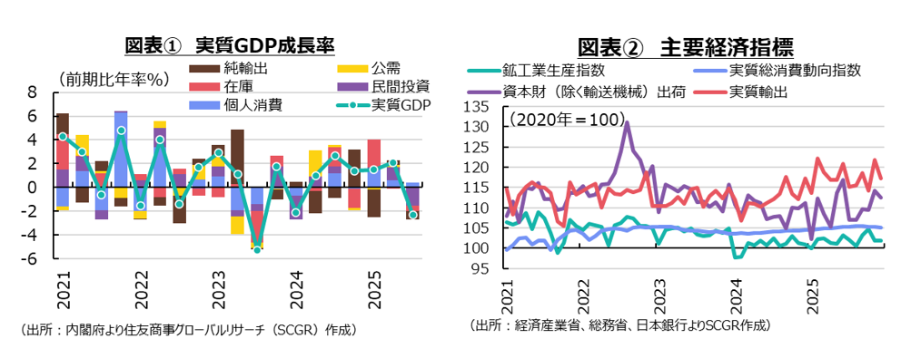 日本経済は、足踏みが一部に残る中で緩やかに回復してきた。2025年第3四半期(Q3)の実質GDP成長率(前期比年率▲2.3%)は、6四半期ぶりのマイナス成長だった(図表①)。内訳を見ると、住宅投資(前期比▲8.2%)や輸出(▲1.2%)などが減少した影響が大きかった。住宅投資の減少は、建築基準法や建築物省エネ法の改正によって4月から新築住宅に省エネ基準適合が義務付けられる前の駆け込み需要が生じた反動減であり、住宅投資自体が進捗ベースでGDP統計に計上されるため、Q3に減少が表れた。また、輸出では財貨(▲1.1%)以上にサービス(▲1.6%)が減少していた。訪日観光客の消費額である旅行収支の受取額の減少が目立っていた。