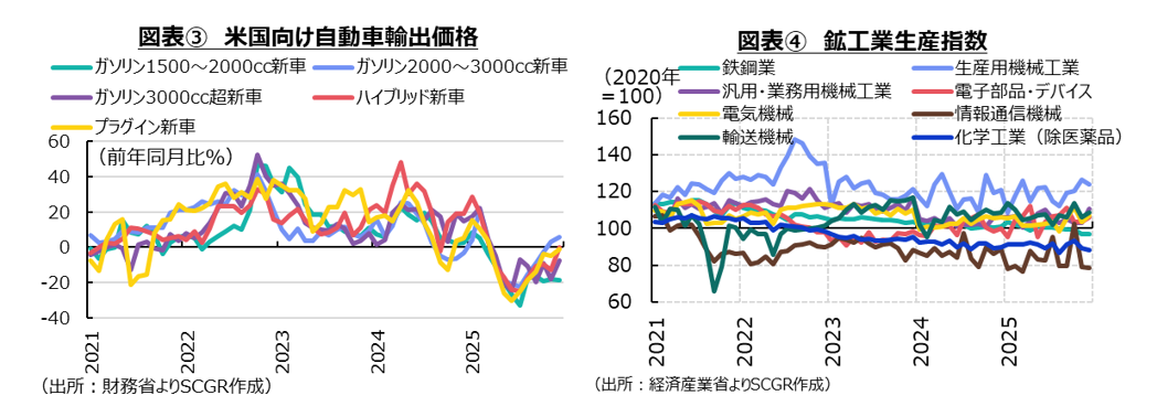 米国の関税で注目された自動車について、日本銀行「企業物価指数」の北米向け乗用車の輸出物価指数(契約通貨ベース)は12月に前年同月比▲14.7%となり、7月(▲20.9%)から下落率を縮小させた。自動車関連の追加関税が25%から12.5%へ引き下げられた影響が表れたものの、下落自体は継続している。日本企業が関税負担をしていることは事実とみられる一方、これらの2桁減の数字に比べて、実際のコスト負担が小さい可能性がある。なぜなら、輸出のうち相対的に価格が低い車種が増え、かつそれらの価格が緩やかに持ち直してきた中で、全体の輸出価格が低下してきたからだ。つまり、輸出価格の低下が、関税コスト負担と低価格車種の相対的な増加によって生じている可能性がある。財務省「貿易統計」の米国向け自動車輸出の内訳を見ると、2025年に前年同月比で数量が増えたのは2,000~3,000ccのガソリン車やハイブリッド車だった。米国内の物価上昇などもあり、ニーズが変化したことも一因だった。前者の円建て価格は12月にかけて2か月連続で前年同月比プラスになり、後者は12月にゼロ%まで持ち直した(図表③)。