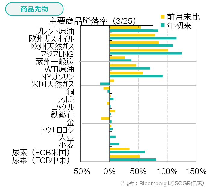 商品先物では、欧州・アジアのエネルギーが高く、米国エネルギーは相対的に上昇が小さい。また、原油以上に精製燃料の値上がりが大きい。メタルはドル高や景気悪化懸念もあって全体に弱含んでいるが、中東からの供給に対する依存度により温度差もある。情勢が幾分落ち着けば、主にアジアや中東のマクロ経済への影響、データセンター建設ラッシュの前提となる「安価で安定したエネルギー供給」の揺らぎなどが需要見通しの再評価につながる可能性もある。