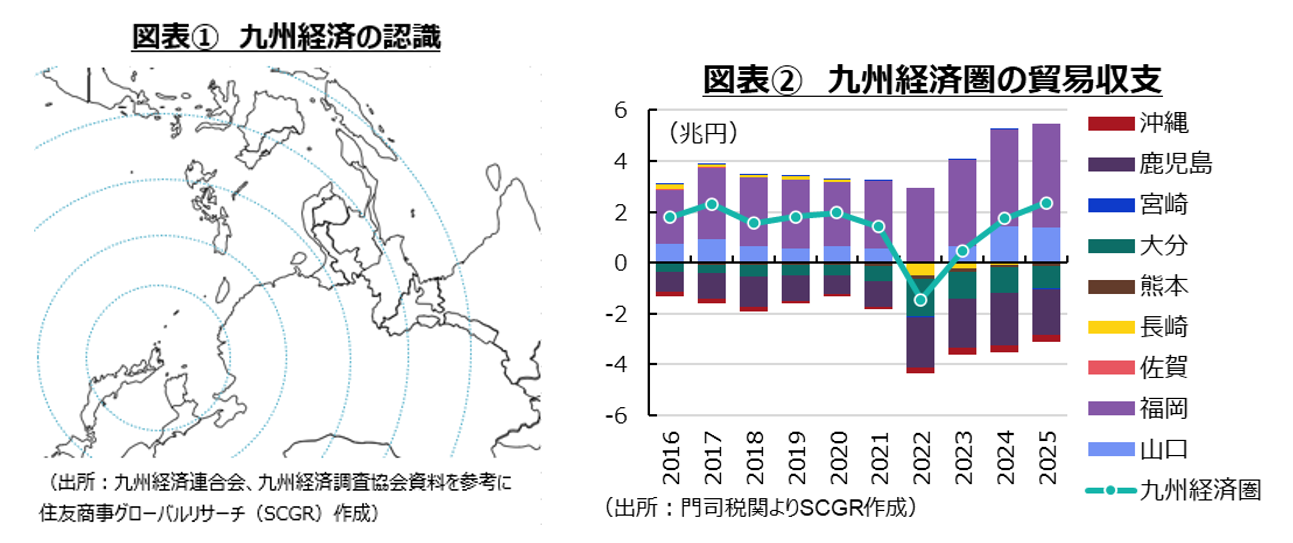 - アジア経済との結び付きを踏まえずして、九州経済の動向を考えることはできない。九州経済圏の貿易収支を見ると、日本全体の貿易収支とは違った構図が見られる。東アジアやASEANとの供給網の深化の中で、九州経済の重要性は高い。