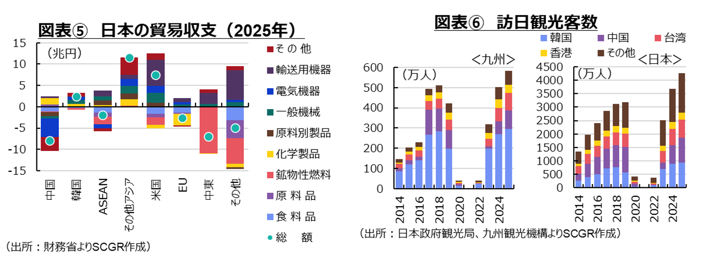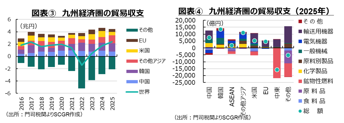 2025年の九州経済圏の貿易収支を貿易相手別に見ると、中国(0.8兆円)や韓国(1.4兆円)、米国(0.5兆円)、EU(0.5兆円)との貿易収支はいずれも黒字だった(図表③)。それに対して、2025年の日本全体では、米国(7.5兆円)や韓国(2.5兆円)の貿易収支は黒字だった一方で、中国(▲7.9兆円)やEU(▲2.7兆円)の貿易収支は赤字であり、九州経済圏が中国とEUでも稼いでいることが特徴として挙げられる。