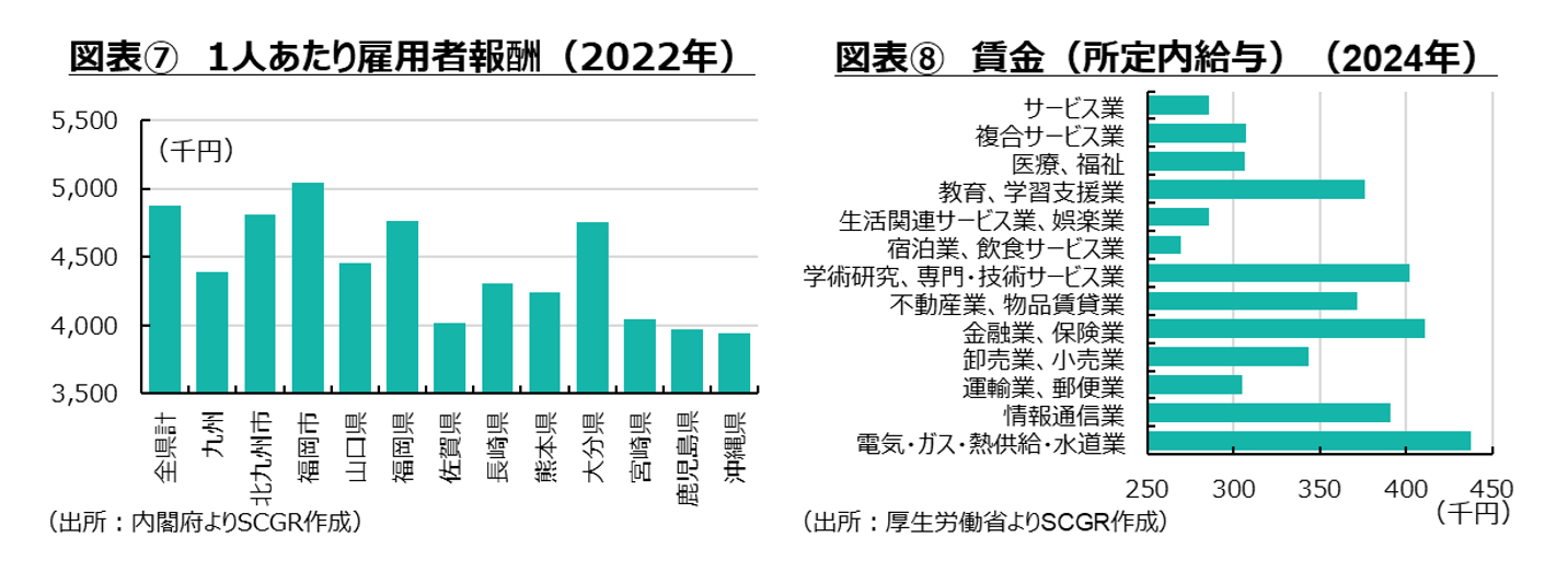 例えば、1人あたりの雇用者報酬を見ると、全県計に比べると、九州経済圏は低い傾向がある(図表⑦)。もちろん、都市部のうち福岡市は全県計を上回っており、北九州市もほぼ全県計並みと、高い地域もある。しかし、福岡県と大分県を除くと、1人当たり雇用者報酬が全県計よりも低い傾向がある。