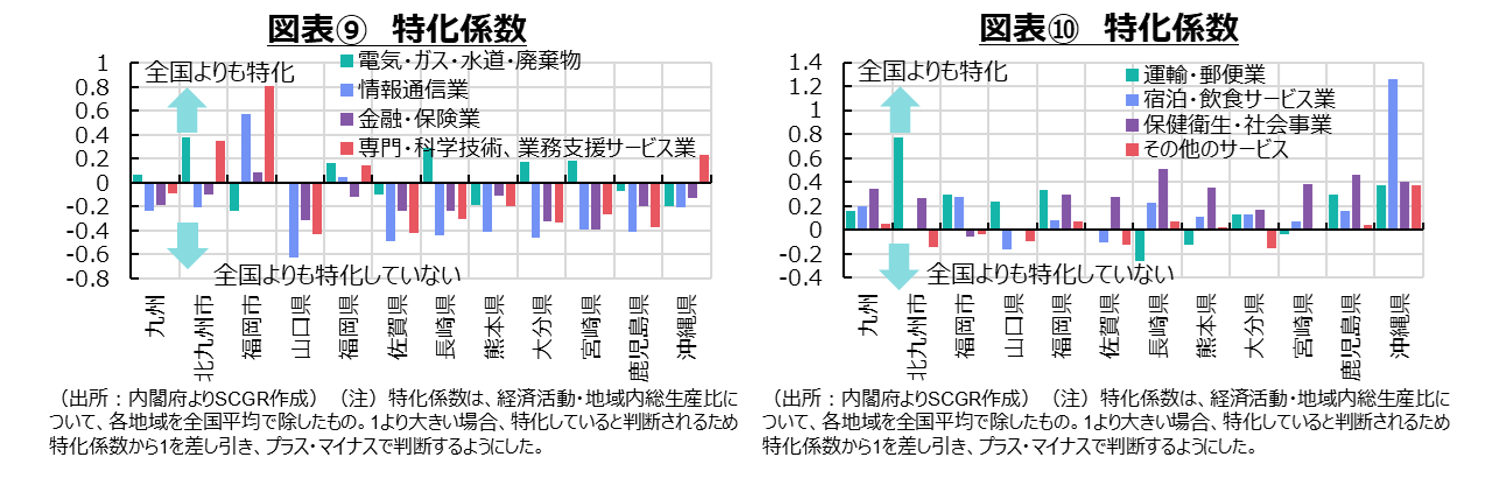 そこで、サービス業のうち、相対的に賃金水準が高い産業について、付加価値の合計である県内総生産を用いて特化係数を計算してみた(図表⑨、⑩)。特化係数とは、各産業の構成比について、各地域の数値を全県計の数値で除したものであり、1より大きいとその地域が全県計よりもその産業に特化していると言える。ここでは、特化係数から基準となる1を差し引くことで、プラスとマイナスを判断の基準にしている。