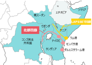 図表③: 東アフリカ共同体(EAC)加盟国(水色)と北部回廊・LAPSSET回廊概略図