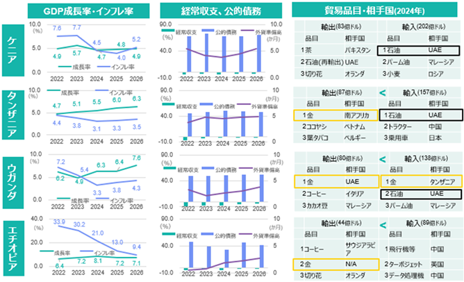 - 特に、地域の核をなすケニア、タンザニア、ウガンダ、エチオピアなどの農業国では、中東産肥料の高騰・逼迫が生産コストを押し上げるとともに、農産品・金の輸出にも負の影響を及ぼすとみられる。