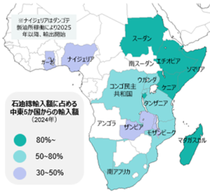 東アフリカを国別にみると、ケニアは、石油を安価かつ安定的に調達する観点から、アラブ首長国連邦(UAE)のアブダビ石油公社(ADNOC)等と長期の調達契約を結んでいる。ケニアの石油輸入の80%が湾岸5か国(UAE、オマーン、ケニア、サウジアラビア、クウェート)からの輸入で占められている(2024年、国連貿易統計)。