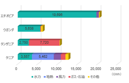 図表⑦. 東アフリカ主要4カ国の発電量および電源構成(2023年)