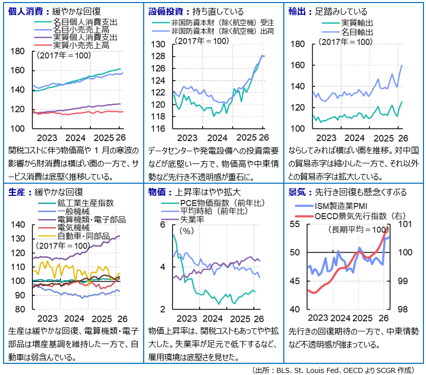 【概観】 米国経済は、緩やかに回復している。2025年Q4の実質GDP成長率(年率換算+0.7%)は、3四半期連続のプラスだった。ただし、関税率引き上げによるコスト増に伴う物価上昇傾向などから低・中所得者の消費が伸び悩む一方で、株高の恩恵を受けた高所得者の消費が堅調さを保つ「K字型経済」の側面も見られている。個人消費は1月に寒波の影響からやや勢いを欠いた後、2月には持ち直した。また、設備投資は、データセンターや電力関連が底堅かった。