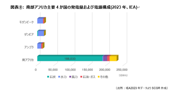 南アは再生可能エネルギーの導入を進めているが、依然として約8割の電源を国内で豊富に産出される石炭を用いた火力発電に依存している(2023年、IEA、図表⑧参照)。前述の通り、Eskomが安定的に国内の石炭火力発電所の維持管理ができれば、緊急発電のディーゼル輸入需要が急激に高まることはない見込みだ。