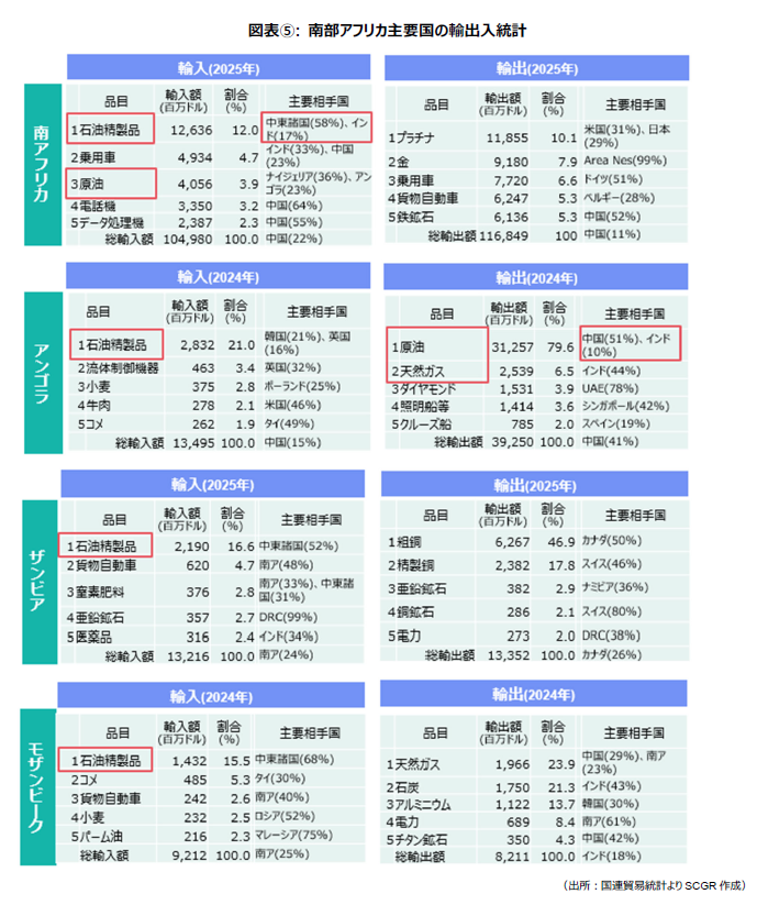 東アフリカと同様に、南部アフリカでもホルムズ海峡封鎖による油価高騰と、供給の逼迫は経済を直撃している。図表⑤のとおり、南部アフリカ各国の最大の輸入品は石油精製品だ。東アフリカほどではないが、中東諸国(アラブ首長国連邦、サウジアラビア、クウェート、カタール、バーレーン、オマーン)からの石油輸入量は南アで約6割、ザンビアで約5割、モザンビークで約7割と依存度が高い。また、国内に石油精製施設を持つ南アは、原油の輸入も行っている。原油は主にナイジェリアやアンゴラなど域内の産油国から調達しているが、国際的な市況価格の上昇と連動するため、原油輸入額は増加する。