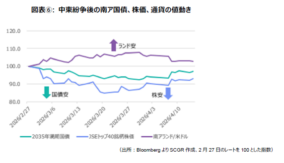 また、市場はすでに中東紛争が南ア経済にマイナスの影響を及ぼすことを織り込んでいる。開戦前の2月27日の南アの代表的な長期国債「2035年満期債(利率8:85%)」、ヨハネスブルグ証券取引所(JSE)トップ40企業銘柄の株価、南アの通貨ランドの対ドル為替レートを100とした指数を取ると、全てが開戦前より下落(図表⑥参照)。いわゆる「トリプル安」の状況だ。4月に入ってからはいずれも持ち直しの動きがみられるが、ランド安が続けば、輸入価格を押し上げ、インフレを加速させる要因となる。