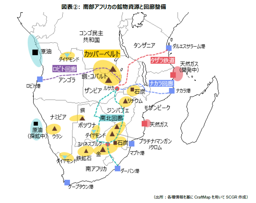 その南部アフリカ域内では、主に鉱物輸送の円滑化のために、道路・鉄道整備を軸とする「経済回廊」の開発が複数進展している(図表②参照)。南アのダーバン港から内陸国のザンビアのカッパーベルトまでを結ぶ「南北回廊」や、同じくカッパーベルトからインド洋のナカラ港を結ぶ「ナカラ回廊」には日本政府も支援を行っている。そのほかにも、トランプ政権下で、重要鉱物の獲得に熱心な米国が参画する「ロビト回廊」では、カッパーベルトと大西洋間の物流効率化が図られている。中国も1970年代に整備したタンザニアのダルエスサラーム港からカッパーベルトを結ぶ「タンザン鉄道」のリハビリを進めている。