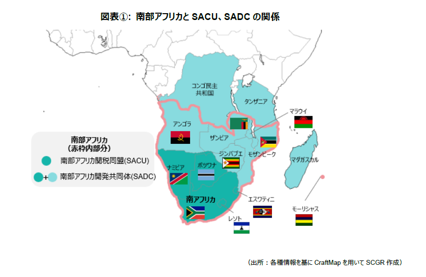 このSACUを中心として、同心円状に拡大した地域経済共同体(RECs)が「南部アフリカ開発共同体(SADC)」だ(図表①参照)。SADCは1992年に設立され、コンゴ民主共和国(DRC)、タンザニアを含め16か国が加盟している(なお、DRCとタンザニアは「東アフリカ共同体(EAC)」の双方に加盟している)。SADC域内では、SACUほどの経済統合は進んでいないものの、域内関税撤廃のほか、欧州連合(EU)との経済連携協定(EPA)との締結に加え、常設軍ではないがSADC待機軍を有するなど、地域の安全保障面でも協力を深化している。