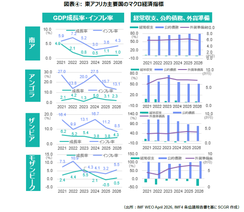 南部アフリカのGDPを国別にみると、南ア(4,271億ドル)、アンゴラ(1,417億ドル)、ジンバブエ(538億ドル)、ザンビア(289億ドル)、モザンビーク(223億ドル)の順で大きい(IMF、2025年4月、図表③参照)。本稿では通貨制度が不安定なジンバブエを除く、上記4か国を南部アフリカ主要国として考察を行う。