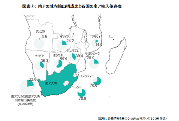 南ア経済が減速すると、南アの輸入額は減少する(ただし、油価高騰による石油・原油輸入額の増加とある程度相殺されるとみられる)。輸入の減少により、関税収入が減ると、SACU加盟国への分配額も減る。そうなれば、他の歳入基盤に乏しい周辺の経済規模の小さい国々の財政悪化をもたらす恐れがある。「南アがくしゃみをすると周辺国は風邪をひく」構造だ。