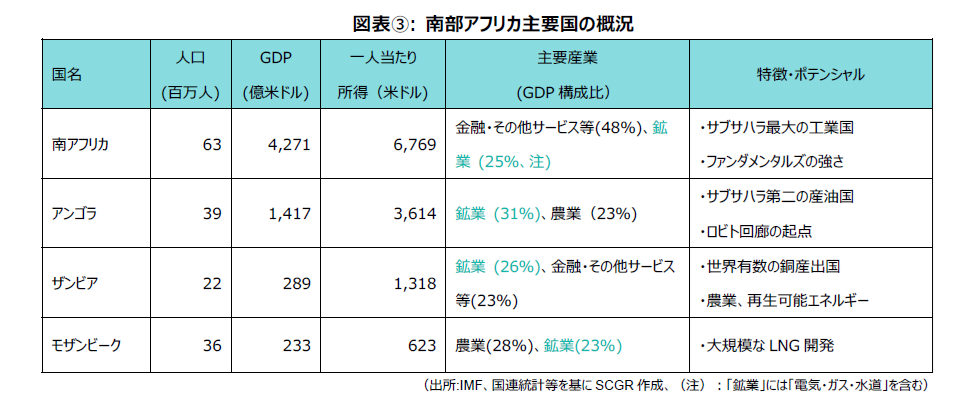 南部アフリカは、サブサハラの中でもGDPに占める鉱業(注1)の割合が最も高い地域だ(26.6%)。例えば、世界有数の銅産出国・ザンビアでは、GDPの約3割が鉱業だ。ボツワナのダイヤモンドは政府歳入の3割に達する。アンゴラでは輸出の8割が原油だ(2024年)。農業が産業の主体である東アフリカとは対照的に、南部アフリカ経済は鉱業を中心に成り立っている(図表②参照)。したがって、鉱業活動や需要に変化が生じれば、南部アフリカ経済全体に波及する。